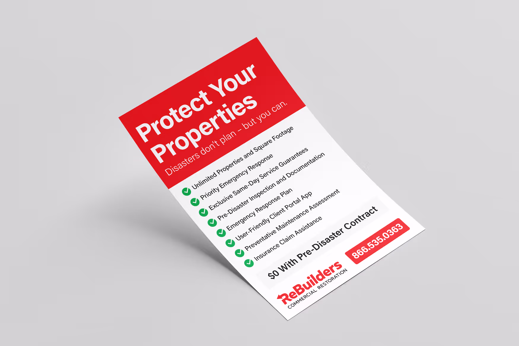 Similarly, Stewart Design supported the launch of two new programs for ReBuilders: Pre-Disaster Plans (PDP) and Rapid Response Guarantee, including naming and service design. Pre-Disaster Plans ensure that every square foot of your properties will be covered with priority access to emergency response, pre-disaster inspection and documentation, exclusive Same-Day Service Guarantees, and more. “That’s what really sets us apart, being proactive not reactive," Judd explains.